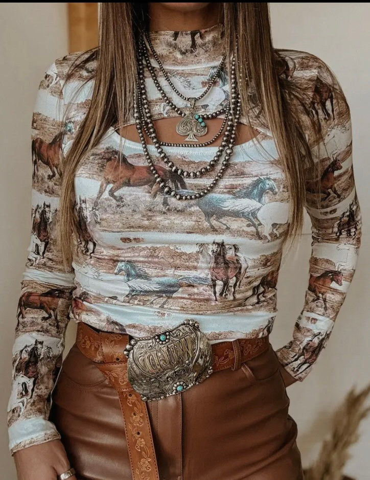 This Wild Horse Print Top adds a sexy touch a Keyhole front. This slim-fitting top flaunts a flattering silhouette with long sleeves and a comfortable high neckline.